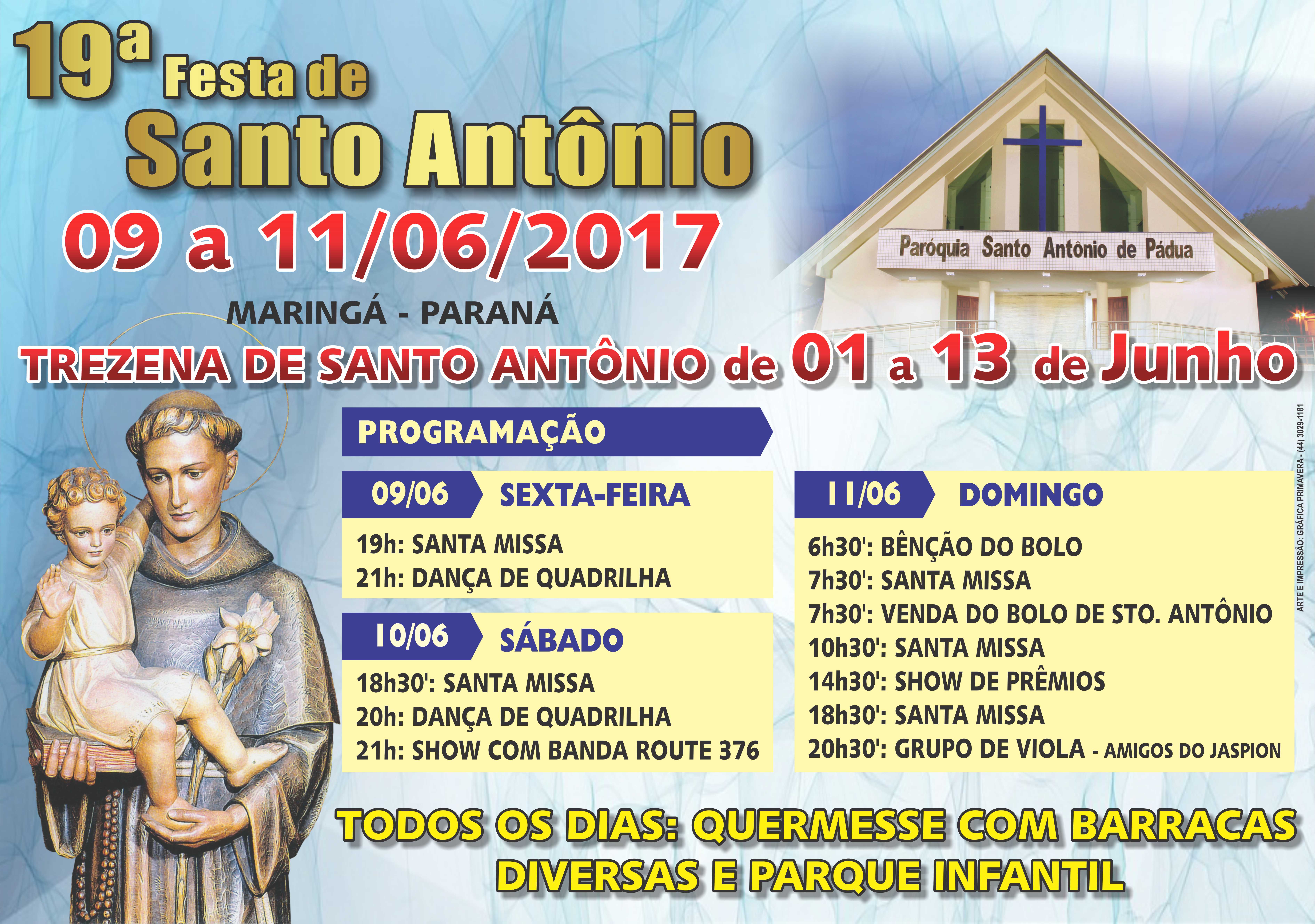 20h – Santa Missa em honra a Santo Antônio de Pádua, padroeiro da comunidade, presidida por Dom Anuar Battisti, Arcebispo Metropolitano de Maringá.