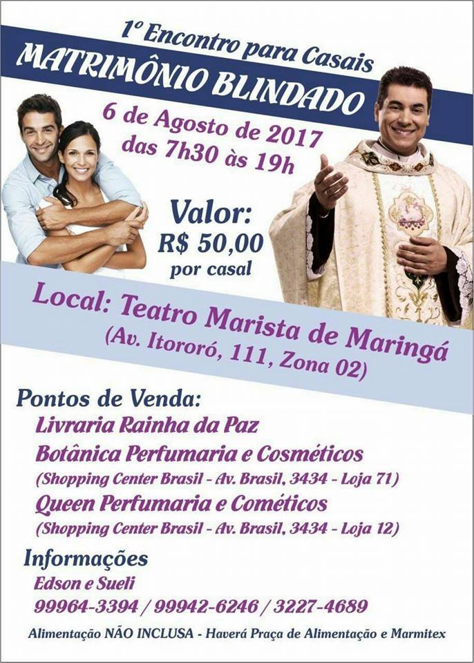 Padre Chrystian Shankar estará em Maringá no dia 06 de agosto para ministrar um encontro para casais com a temática “Casamento blindado”. O evento será realizado no Teatro Marista das 7h30 às 19h.