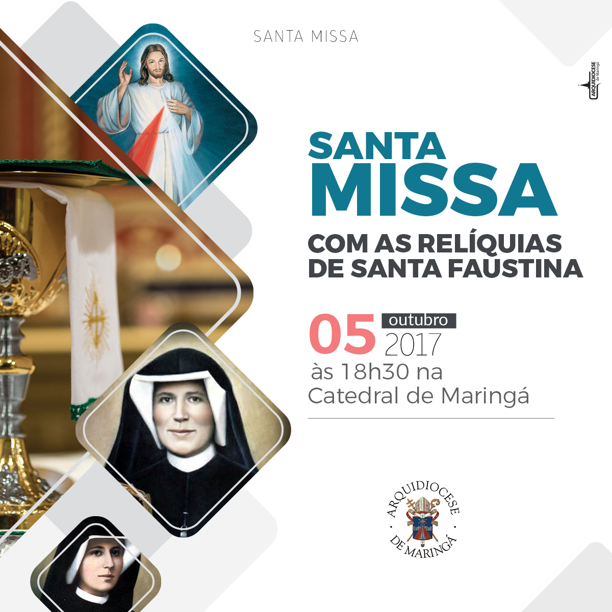 Dia 05 de outubro, quinta-feira, às 18h30 na Catedral de Maringá será celebrada santa missa com relíquia de Santa Faustina. Um grupo de nove pessoas foi a Cracóvia, na Polônia, buscar a relíquia de Santa Faustina para trazer para Maringá.