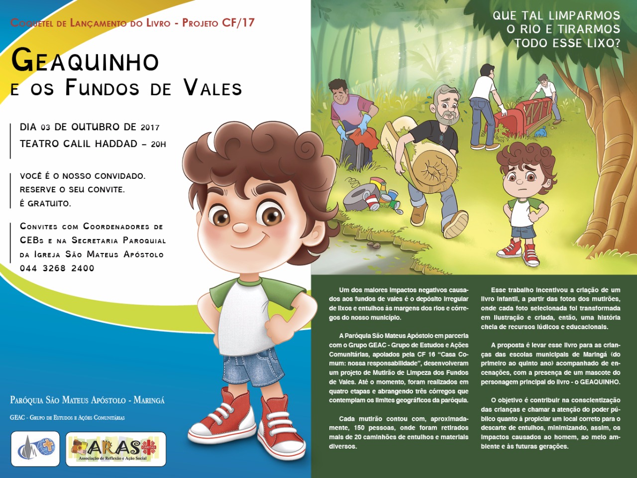 A paróquia São Mateus Apóstolo, em parceria com o Grupo de Estudos e Ações Comunitárias (GEAC), irá lançar na próxima terça-feira (03), em um coquetel no Teatro Calil Haddad às 20h, o livro infantil Geaquinho e os fundos de vales. Uma história ilustrativa que tem por objetivo levar a conscientização ambiental às crianças das escolas municipais.