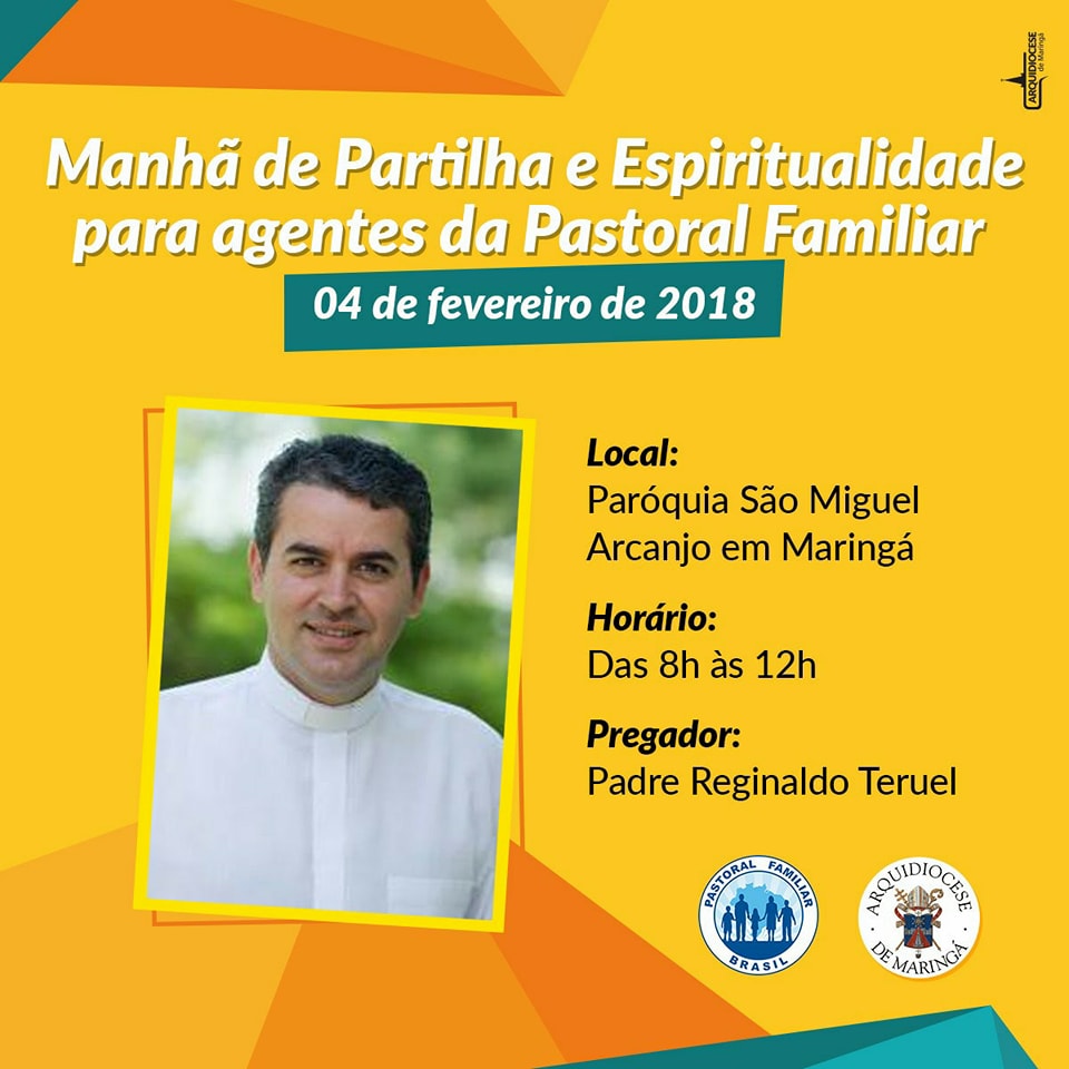 A “Manhã de partilha e espiritualidade” será realizada no dia 04 de fevereiro de 2018, das 8h às 12h, no salão da paróquia São Miguel Arcanjo em Maringá, com a assessoria do padre Reginaldo Teruel. Outras informações e inscrições via e-mail adrielleegb@yahoo.com.br ou mesquitaadmilson@bol.com.br