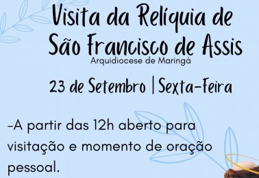 A paróquia São Francisco de Assis, localizada no Jardim Alvorada em Maringá, irá receber a visita da relíquia de São Francisco de Assis, na próxima sexta-feira, 23 de setembro. A relíquia que virá a Maringá é um fragmento de um osso de São Francisco e estará em exposição a partir das 12h, na igreja ...
