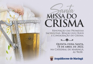 A Santa Missa do Crisma na Arquidiocese de Maringá será celebrada na próxima quinta-feira, 14 de abril, às 9h30 na Catedral Metropolitana Basílica Menor Nossa Senhora da Glória. A celebração, também conhecida como Missa dos Santos Óleos, será presidida pelo Arcebispo de Maringá, Dom Severino Clasen,...