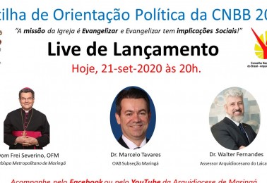 Nesta segunda-feira, 21 de setembro de 2020, o Conselho de Leigos da Arquidiocese de Maringá irá realizar uma Live de lançamento da Cartilha de Orientação Política 2020, com a presença do Arcebispo de Maringá, Dom Frei Severino Clasen. Também haverá a participação do advogado Marcelo Tavarez, OAB Su...