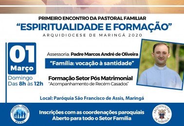 A Pastoral Familiar da Arquidiocese de Maringá promoverá o primeiro encontro arquidiocesano de 2020 no dia 01 de março, domingo. Será na paróquia São Francisco de Assis, em Maringá, das 8h às 12h. A assessoria será feita pelo padre Marcos André de Oliveira, que abordará o tema “Família: vocação à sa...