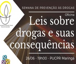 A Pastoral da Sobriedade da Arquidiocese de Maringá convida a população para a oficina sobre “Lei sobre drogas e suas consequências”, que será realizada quarta-feira, 26 de junho, às 19h na PUC Maringá. As inscrições podem ser feitas no link http://twixar.me/gb7nA oficina faz parte da progr...