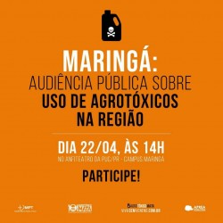 A Aras/Cáritas (organismo da Arquidiocese de Maringá) apoia e é parceira na organização da Audiência Pública sobre o uso de agrotóxicos na região de Maringá. A Audiência é uma iniciativa do Fórum Paranaense de combate aos agrotóxicos, transgênicos e fertilizantes químicos e do Fórum Estadual par...