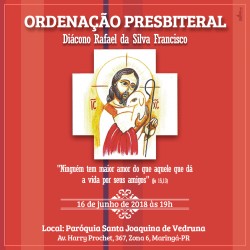 O diácono Rafael da Silva Francisco será ordenado presbítero no próximo sábado (16) às 19h na paróquia Santa Joaquina de Vedruna em Maringá. A celebração será presidida pelo Arcebispo de Maringá, Dom Anuar Battisti.A primeira missa presidida pelo padre Rafael, será domingo (17) às 9h30 na paróqu...