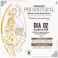 O diácono João Paulo Penco será ordenado presbítero pela imposição das mãos do Arcebispo de Maringá, Dom Anuar Battisti, nesse sábado (02) na paróquia Nossa Senhora de Fátima em Marialva-PR. A Santa Missa está marcada para às 19h. A primeira Missa presidida pelo padre João Paulo será domingo (03...