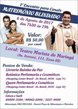 Padre Chrystian Shankar estará em Maringá no dia 06 de agosto para ministrar um encontro para casais com a temática “Casamento blindado”. O evento será realizado no Teatro Marista das 7h30 às 19h.Outras informações podem ser obtidas pelo watss: 044 9 9964 33 94.Veja aqui uma das palestras do pad...