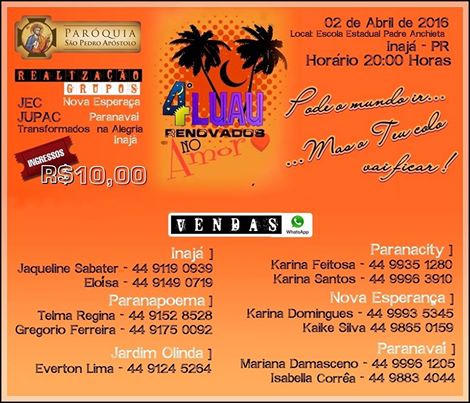 Dia 02 de abril será realizado o quarto Luau Renovados no Amor, às 20h na escola estadual padre Anchieta em Inajá. O evento deve reunir cerca de 600 jovens, de acordo com a organização do Luau. Os ingressos podem ser adquiridos com os próprios jovens que trabalham na organização. Outras informações ...
