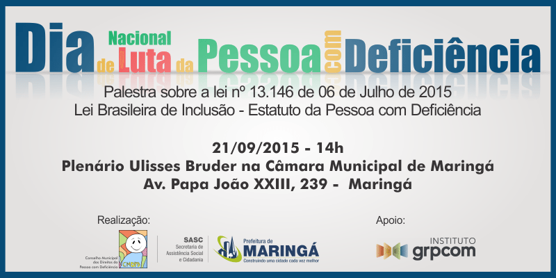 O Conselho Municipal dos Direitos da Pessoa com Deficiência de Maringá e a Secretaria Municipal de Assistência Social e Cidadania, em parceria com o Instituto GRPCOM, realizarão, no dia 21 de setembro do corrente ano em comemoração ao Dia Nacional de Luta da Pessoa com Deficiência, uma Palestra sobr...