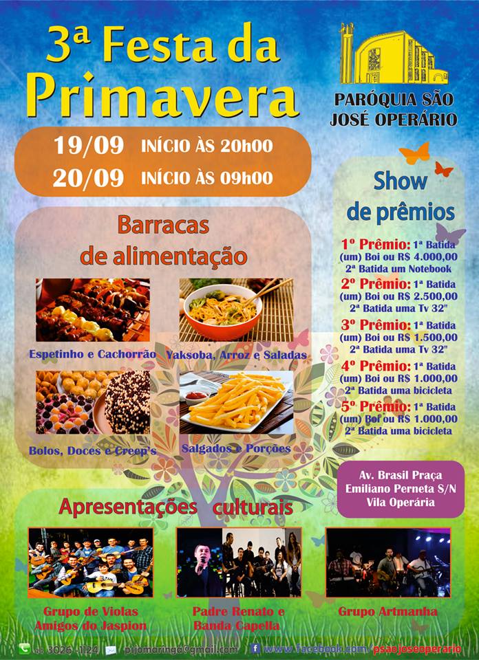 Com apenas três edições, a Festa da Primavera já se tornou tradicional na paróquia São José Operário em Maringá. Este ano ela será realizada nos dias 19 e 20 de setembro com diversas atrações culturais e praça de alimentação. No palco haverá apresentações do padre Renato Quezini e ministério jovem B...