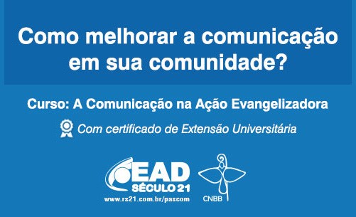 A Comissão Episcopal Pastoral para a Comunicação da CNBB em parceria com a Educação a Distância Século 21 realiza o pré-lançamento do curso “A Comunicação na Ação Evangelizadora – Aprofundamento do Diretório de Comunicação da Igreja no Brasil”. O lançamento oficial do curso será dia 16 de julho, dur...