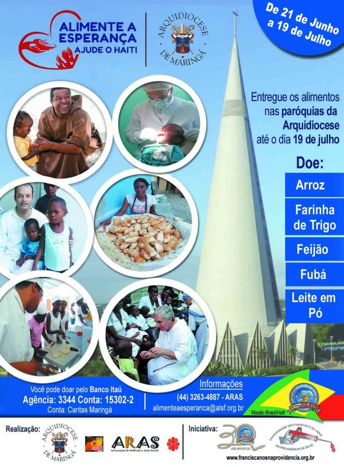Ação segue até 19 de julho; Alimentos podem ser doados nas paróquias e comunidades A Arquidiocese de Maringá está realizando a campanha “Alimente a Esperança – ajude o Haiti”, com o objetivo de arrecadar alimentos para o país mais pobre das Américas. A campanha é realizada por meio da ARAS/Cáritas d...
