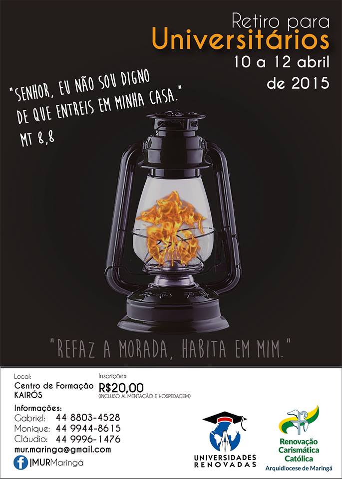 O Ministério Universidades Renovadas (MUR), pertencente à Renovação Carismática Católica com foco de evangelização no âmbito universitário, irá promover retiro para universitários de 10 a 12 de abril de 2015 no centro de formação Kairós em Maringá. Local: Centro de Formação Kairós – Rua: Gralha Azul...
