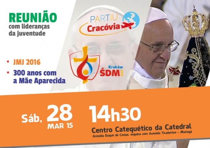 A Arquidiocese de Maringá convida as lideranças paroquiais das pastorais e movimentos juvenis para reunião em que serão apresentadas informações sobre: 1) Pacote de viagem para a Jornada Mundial da Juventude (JMJ) 2016 2) Caravana para participar com jovens de todo Brasil, no Santuário de Aparecida,...