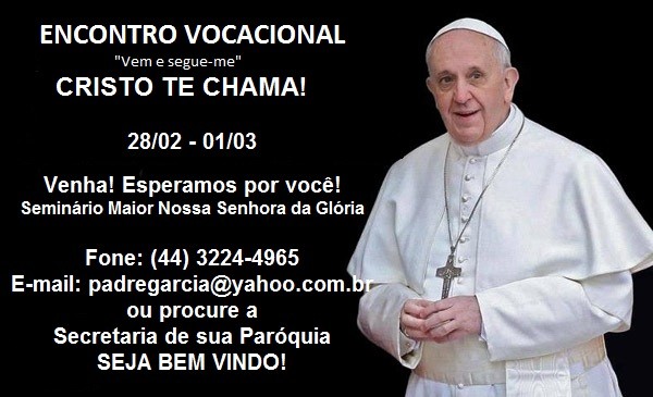 No próximo final de semana, dias 28 de fevereiro e 01 de março, a Arquidiocese de Maringá promoverá encontro vocacional para interessados em ingressarem no Seminário Arquidiocesano Nossa Senhora da Glória. Quem tiver interesse em participar pode entrar em contato diretamente com o padre Francisco Ge...