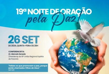 A 19ª Noite de Oração pela Paz terá a sua condução temática sob os cuidados dos espíritas, membros da AMEM – Associação Espírita de Maringá. Seremos exortados pela palestra do Dr. Marcelo Seneda, da cidade de Londrina, sobre o tema "A união pela paz!", dando ênfase a urgência para que todos nos un...