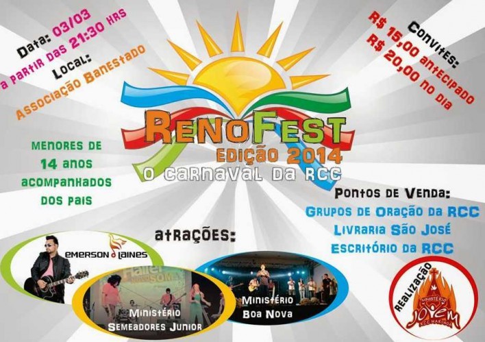 Em Maringá a Renovação Carismática Católica (RCC) vai promover o Renofest 2014, segunda-feira de carnaval. A festa católica será realizada na Associação do Banestado a partir das 21h30. Os ingressos custam R$15 e podem ser comprados com antecedência na Livraria São José ou no escritório da RCC. Na h...