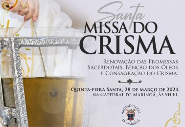 A Santa Missa do Crisma na Arquidiocese de Maringá será celebrada nessa quinta-feira, 28 de março, às 9h30 na Catedral Metropolitana Basílica Menor Nossa Senhora da Glória. A celebração, também conhecida como Missa dos Santos Óleos, será presidida pelo Arcebispo de Maringá, Dom Severino Clasen, e se...
