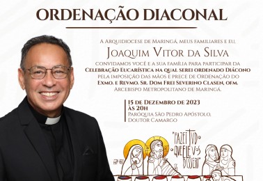 A Arquidiocese de Maringá convida para a ordenação diaconal de Joaquim Vitor da Silva. A celebração presidida pelo Arcebispo Metropolitano Dom Frei Severino Clasen, OFM, será realizada sexta-feira, 15 de dezembro, às 20h, na igreja matriz da Paróquia São Pedro Apóstolo, em Doutor Camargo. Joaqu...