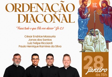 Domingo, 28 de janeiro de 2024, quatro seminaristas da Arquidiocese de Maringá serão ordenados diáconos transitórios na Catedral de Maringá. César Endrice Massuria, Jonas dos Santos, Luiz Felipe Ricciardi e Paulo Henrique Ramires da Silva concluem o curso de Teologia em 2023 e serão ordenados p...