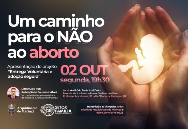 O Setor Família da Arquidiocese de Maringá promoverá um evento de apresentação do Projeto Entrega Voluntária e Adoção Segura, no dia 02 de outubro, segunda-feira, às 19h30, no auditório Santa Irmã Dulce dos Pobres, na Paróquia Menino Jesus de Praga e São Francisco Xavier. Com o nome “Um caminho para...