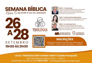 A Escola de Teologia para Cristãos Leigos da Arquidiocese de Maringá promoverá a Semana Bíblica entre os dias 26 e 28 de setembro. Neste ano, em sintonia com o mês da Bíblia e a proposta da CNBB, refletirá sobre a Carta aos Efésios. O evento, que será realizado no salão da Paróquia Santa Maria Goret...