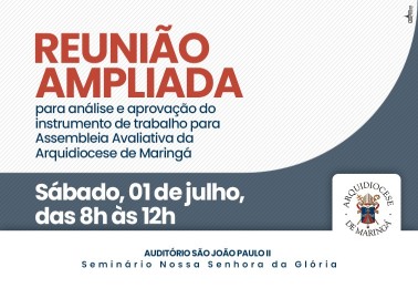 No próximo sábado, dia 01 de julho, todas lideranças pastorais da Arquidiocese de Maringá são convidadas a participar de uma reunião ampliada em que será apresentada a proposta de um instrumento de trabalho para a Assembleia Avaliativa. O encontro será realizado no auditório São João Paulo II, no Se...