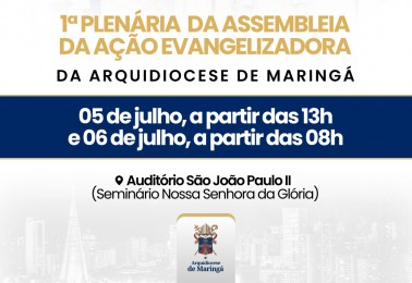 Arquidiocese de Maringá realiza Primeira Plenária da Assembleia da Ação Evangelizadora No próximo fim de semana, dias 5 e 6 de julho, cerca de 700 lideranças estarão reunidas na Primeira Plenária da Assembleia da Ação Evangelizadora da Arquidiocese de Maringá. O evento acontecerá no Auditório S...