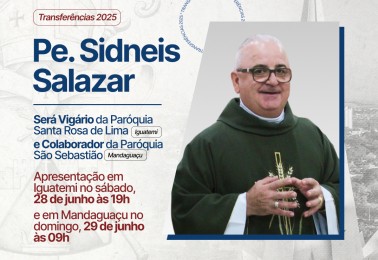 A Arquidiocese de Maringá comunica que o padre Sidneis Salazar atuará como vigário da Paróquia Santa Rosa de Lima, em Iguatemi, e colaborador da Paróquia São Sebastião, em Mandaguaçu.A missa de apresentação em Iguatemi será celebrada no sábado, dia 28 de junho, às 19h. Em Mandaguaçu, a apresentação ...